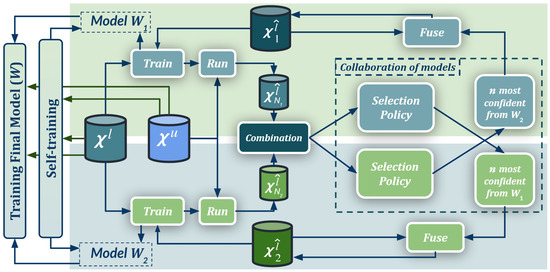 Algorithm 3 summarizes the co-training procedure supporting the scheme shown in Figure 1, which is based on the previous self-training stage (Algorithm 1), on combining pseudo-labels, as well as on a model collaboration stage (Algorithm 2). We detail Algorithm 3 in the following.