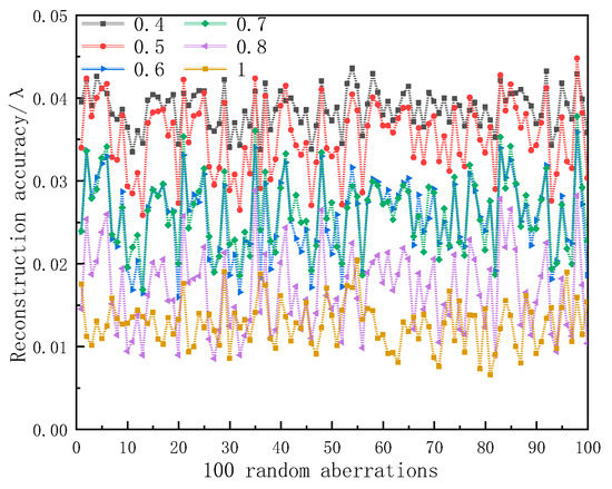 Here, P = 5.5 μm is the pixel size and λ = 1064 nm is the wavelength. If p ≥ 10, then f ≥ 22 d. The lens size we chose was 25.4 mm and then the focal length of the lens could be determined. By adding a diaphragm in front of the lens, the accuracy of the wavefront reconstruction was compared under different duty cycle factors. Taking the arrangement of the 8 × 8 lens array as an example, under the conditions of different duty cycle factors, the reconstruction accuracy results for the same group of random wavefront aberrations are shown in Figure 2. The random aberration here was based on the systematic aberration of a solid-state laser.