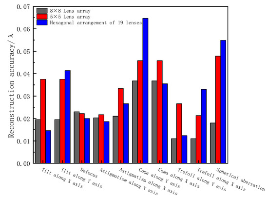 From the reconstruction results of each single aberration, the reconstruction accuracy of the 8 × 8 lens array for each order of single aberrations was better than the hexagonal arrangement of 19 lenses and the 5 × 5 lens array arrangement. For different types of aberration wavefronts, different arrangements will also bring about different reconstruction accuracy characteristics. Both the 8 × 8 array arrangement and the 5 × 5 array arrangement were center-symmetrical structures, so the reconstruction accuracy in the x-direction and y-direction for the aberrations in the two fixed directions of tilt and coma was consistent. However, due to its structural characteristics, the hexagonal arrangement had a better reconstruction accuracy of aberrations in the x-direction than in the y-direction for the aberrations in a fixed direction.