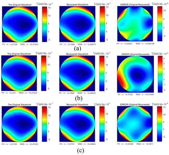 Simulation example of wavefront reconstruction: (a) hexagonal arrangement of 19 lenses; (b) 8 × 8 lens array; (c) 5 × 5 lens array.