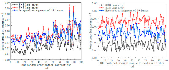 Combining Figure 7, Table 3 and Table 4, it can be seen that for the random combined aberrations, the 8 × 8 lens array had the best reconstruction accuracy and the most stable reconstruction results. The average reconstruction accuracy for 100 groups of random combined aberrations and combined aberrations with a certain weight was 0.025 λ and 0.0167 λ, respectively. As the arrangement of the 5 × 5 lens array was the same as that of the 8 × 8 lens array, the trend of the reconstruction accuracy of the two arrangements for the same aberration was basically the same. However, it was limited by the small number of lenses, so its average reconstruction accuracy for the two combined aberrations was 0.046 λ and 0.0459 λ, respectively. Although the hexagonal arrangement of 19 lenses had fewer lenses, its arrangement had a greater space utilization rate, so the reconstruction accuracy of the aberration was better than that of the 5 × 5 array arrangement. The average reconstruction accuracies of the two combined aberrations were 0.042 λ and 0.032 λ, respectively.