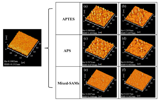AFM images of silica surfaces. This figure shows two representative AFM images for each modified surface sampled in different areas. (a,b) APTES-modified silica surface; (c,d) APS-modified silica surface; and (e,f) mixed-SAMs-modified silica surface.