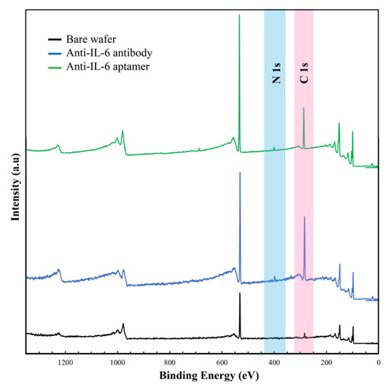 The XPS survey spectra of the bare wafer (in black), wafer surface with immobilized anti-IL-6 antibody (in blue), and wafer surface with immobilized anti-IL-6 aptamer (in green).