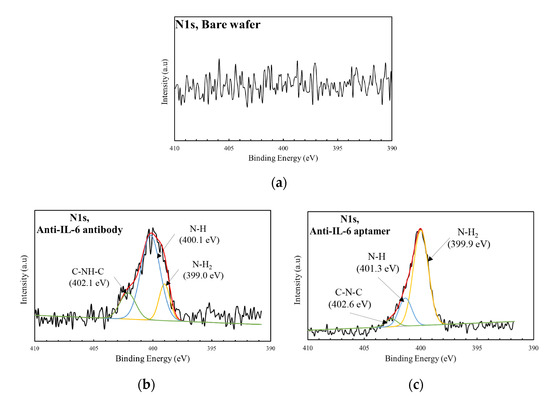 Moreover, the XPS survey spectra were applied to evaluate the elemental and atomic compositions on the wafer surface. Figure 3 shows the XPS survey spectra of the bare wafer, the wafer surface with immobilized anti-IL-6 antibody, and the wafer surface with immobilized anti-IL-6 aptamer. The survey spectra of the bare wafer showed the presence of major peaks due to elements such as oxygen (O 1 s) and carbon (C 1 s) peaks. Upon the immobilization of the anti-IL-6 antibody, a significant increase in carbon (from 17.6 to 43.6%) and nitrogen (N 1 s) (from 0.3% to 2.1%) was observed. In addition, a significant increase in carbon (from 17.6% to 28.6%) and nitrogen (from 0.3% to 1.5%) was also observed after the immobilization of the anti-IL-6 aptamer. The increase in N 1 s intensity at the Si-mSAMs-GA-Ab surface was attributed to the peptide bonds within the immobilized antibody. On the other hand, the nitrogen atom within the aptamer base was the main reason for the increased intensity of N 1 s at the Si-mSAMs-GA-Apt surface. In addition, the increase in the peak of C 1 s was mainly contributed by the mSAMs composed of the PEGs with long carbon chains in the structures. Figure 4 shows the high-resolution spectra of N 1 s for bare silicon wafer, Si-mSAMs-GA-Ab surface, and Si-mSAMs-GA-Apt surface. For the Si-mSAMs-GA-Ab surface (Figure 4b), the binding energies were at 402.1, 400.1, and 399.0 eV, corresponding to C-NH-C, N-H, and N-H2, respectively. The deconvolution of the N 1 s for Si-mSAMs-GA-Apt surface in Figure 4c was fitted into three components. The components at 402.6, 401.3, and 399.9 eV were assigned to C-N-C, N-H, and N-H2, respectively. According to the AFM and XPS analyses, the anti-IL-6 antibody or anti-IL-6 aptamer was confirmed to be successfully immobilized on the wafer surface.
