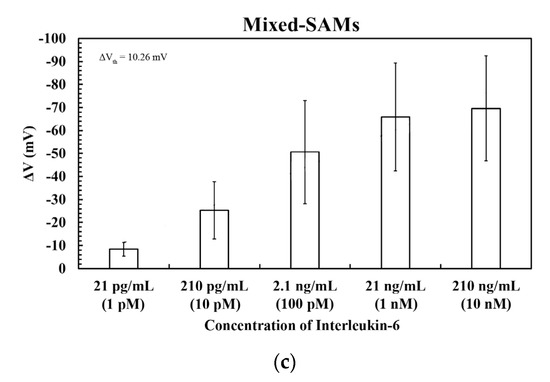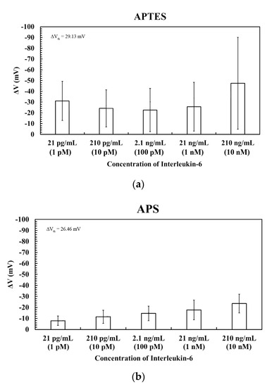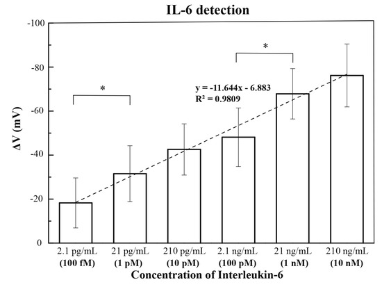 Figure 5b shows the experimental results for detecting IL-6 by using the FET devices with the modification of the APS-GA-Ab layer. The standard deviation of the blank experiments was −8.82 mV. Therefore, the measured electrical signals could be regarded as effective signals in that the absolute signal values were greater than 26.46 mV. From Figure 5b, it could be noticed that a trend existed with increasing concentrations of IL-6. However, the voltage changes of five concentrations were almost all less than 26.46 mV, so they were still regarded as background noises.