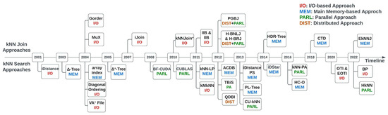 For a clear understanding of the methods and their development, we have included a timeline of the kNN Join and kNN Search techniques in Figure 3. We included all of the kNN Join techniques in the top region of the figure and the kNN Search techniques in the lower region. In Figure 4, we also present the block flow diagram of exact kNN query techniques based on the different classification categories we talked about above. Almost all the kNN queries that we have discussed in our work utilise Euclidean distance, except the BP technique, which uses the Bregman distance. Here, we indicate the Bregman distance-based technique with the symbol. The * symbol denotes a method that employs both distributed and parallel Computing Paradigms.