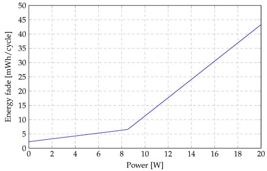 The batteries used in the simulation are modelled based on the Panasonic 18650 Li(NiCoMn)O2 cell, which has a nominal voltage of 3.6 V and a cell rating of 2.25 Ah. The estimated energy fade of a Panasonic battery cell is presented in Figure 1. The ageing cost of a 2.25-Ah battery cell can be evaluated by approximating Figure 1 with two linear functions represented in Equation (32), where is the battery ageing cost in SGD, is the cost of the battery in SGD, is the charging/discharging power, is the initial battery capacity in is the end of life battery capacity in and is the ageing ratio between charging and discharging of the battery.