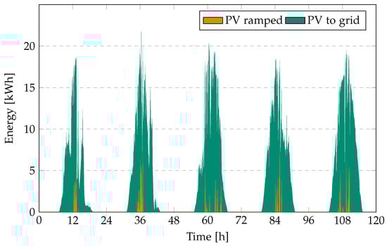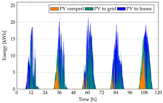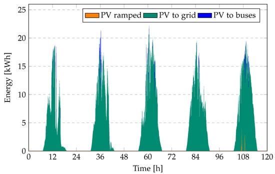 Figure 10 and Figure 11 present the total energy provided by the PV system, the amount of ramped PV energy, and the total energy fed to the grid at a 10% PV ramp limit for the bus operator’s objective (Equation (17)) and the PV operator’s objective (Equation (18)).