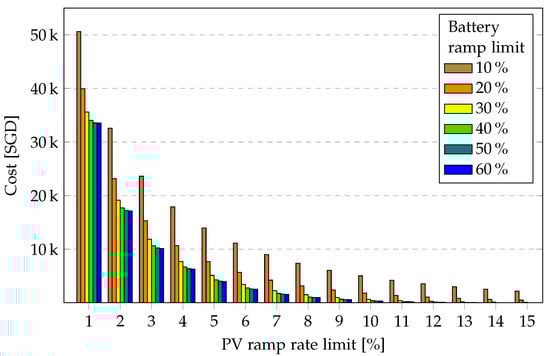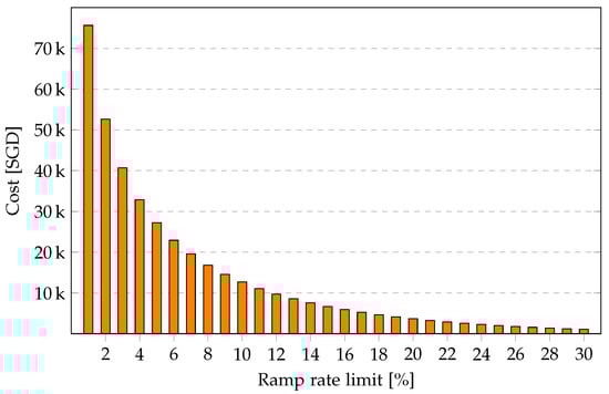 Figure 4 shows the PV ramped energy cost in SGD for the entire year for PV ramp rates from 1% to 30%. The cost for 1% is above SGD 70 k and drops sharply for ramp rate limits of 5% and below, then the decrease slows down.