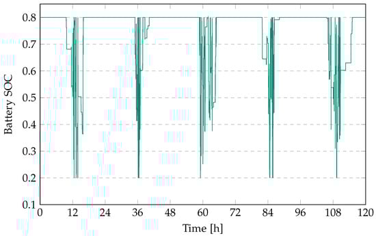 The battery SoC for a 13.5-kWh battery over a period of five days.