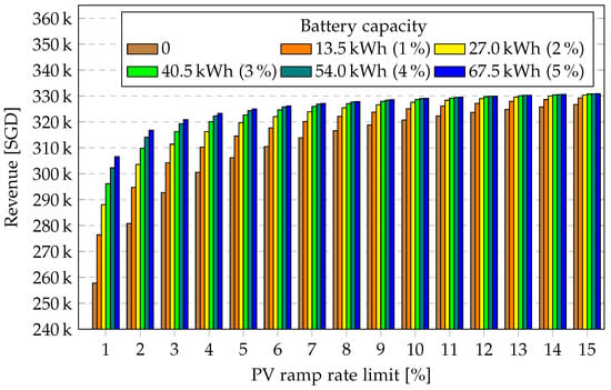 In Figure 7, the revenue generated from energy fed to the grid for the entire year is presented without storage system and for the five chosen battery capacities for maximum permitted PV ramp rates of 1% to 16%. As expected, as the battery capacity increases and as the PV ramp rate increases, more energy is fed to the grid, generating increasing revenue. As the PV ramp rate increases, the total energy fed into the grid saturates and the marginal revenue decreases. The highest increase in revenue from energy to grid is observed at lower battery capacities and lower PV ramp rates.