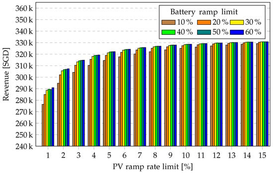In Figure 8, the PV ramp cost for the entire year is presented for a 13.5-kWh battery for various battery ramp limits over the PV ramp rate limit. When the battery ramp limit is increased from 10% to 20%, a significant drop in PV ramp cost is achieved. Beyond 40%, however, no significant benefit is achieved; rather, it could be detrimental to the battery due to degradation. A similar depiction is observed in Figure 9, with increasing energy-to-grid revenue for increasing battery ramp limit. Beyond a certain battery ramp limit, the marginal increase in revenue may not offset the cost of battery degradation.