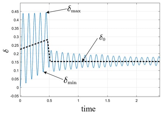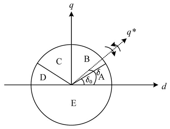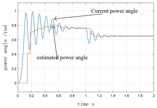 When and , record the value of the power angle at this moment as . When and , record the value of the power angle at this moment as . From Formula (19), it can be seen that the stable power angle is related to the speed and the load. When the torque load is constant, only the speed affects the power angle. It can be considered that the stable point of the power angle also changes uniformly with time in the stage of uniform acceleration. When the speed is at a constant speed, the stable point of the power angle remains unchanged.