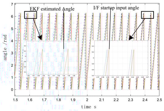 The figure illustrates that when the load is constant, and the rotational speed is stable, the sensitivity of the change in the difference angle to the current is greatly reduced as the difference angle approaches zero. This will result in the entire system becoming unstable. This paper designs a regulation mechanism to rapidly reduce the feedback amount to the current when the difference angle is less than a certain value, and to change the position of the switching point to increase the overall system’s stability during the current regulation process. This ensures that the current remains constant before and after switching to EKF high-speed control. Due to