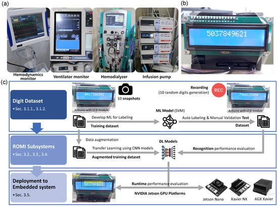 A real-time optical digit recognition embedded system. (a) Medical devices in ICUs. (b) A proof-of-concept device. (c) Flow diagram of the development of ROMI.