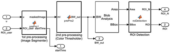 We implemented the blob analysis function by using a blob analysis block in Matlab Simulink, and the output value of the block was also used in the next step to determine the final ROIs.