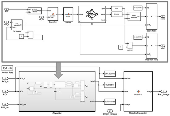 Digit recognition crops a binary image from each ROI and classifies the number. The number of digits can be zero or several, depending on the image. To enable digit recognition on multiple digit variables, we use thed For iterator subsystem block in Matlab Simulink. The iterative subsystem was run as many times as the number of digit variables on the LCD display. Figure 4 shows a classifier block in digit classification. Depending on the number of ROIs , the classifier block performed the classification task iteratively. In the classifier block, the pre-processing cropped the input image to the ROI size in the block and then resized the cropped image to fit the input size of the deep learning model in the block. The DL model predicted labels and predictive scores for the ROIs and sent them to the output. The block created a recognized image by annotating the original image with ROIs and labels.