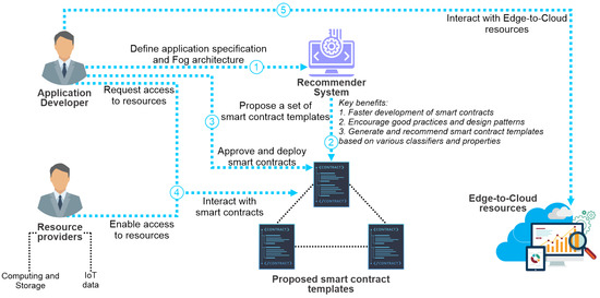 The baseline scenario (see Figure 1) of our solution is motivated by the above-elaborated problems and envisions the implementation and utilization of a novel blockchain recommender system that will perform the following: (1) compose smart contract templates that are based on the application’s specification, following good practices and design patterns; (2) facilitate the blockchain implementation by providing the IoT developers with reliable, standardized smart contracts for their use cases; (3) accelerate the overall development and implementation of smart contracts in IoT environments. Moreover, it will enable peer-to-peer (P2P) transactions between the application’s developers and the resource providers. In other words, the scenario currently targets two essential groups of potential users: The IoT application developers and the resource providers. The complete workflow is composed of five consecutive steps: