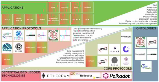 Figure 2 depicts the high-level multi-layer architecture of the ONTOCHAIN framework. The blockchain layer provides a distributed execution environment that enables access to multiple distributed ledger networks that the ecosystem stakeholders can utilize. The ontologies layer comprises novel ontologies that can be managed in a trusted and secure manner. The application and core protocols and services enable seamless interaction between the framework’s layers. Namely, these interoperability protocols offer identity management, reputation management, data provenance, market mechanisms, and other functionalities that the applications of the ecosystem can exploit.
