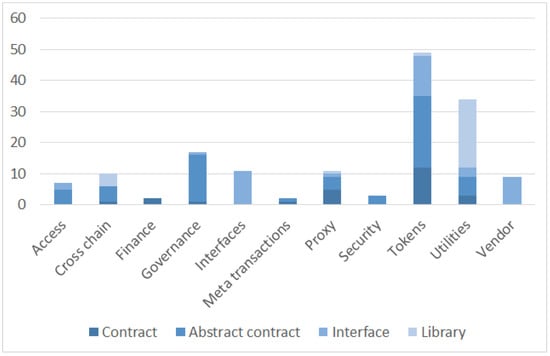 The main categorization based on the described modules above consists of smart contracts proposed by the library authors consisting of different types of smart contracts and smart contract quantitative coverage, as depicted in Figure 3. Our classification is derived from the main categories relying on inheritance levels and interconnections from the perspective of available functionalities, as presented in the following subsections.