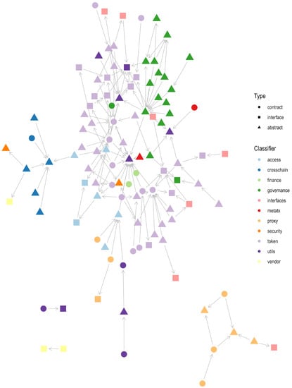 The design of smart contracts follows standard object-oriented programming features, such as an extension of the functionalities of a program to encourage the development of individual ready-to-use modules in a comprehensive smart contract. For example, developers strive to more systematically separate codes, reduce the dependencies, import directives, increase the re-usability of existing programming code, and even enforce the proposed workflow (e.g., voting smart contract). In the initial OpenZeppelin analysis, 65 individual smart contracts and 90 smart contracts were involved in the inheritance. The inheritance is represented either as extended in a smart contract or defines the module’s fundamental behavior, functions, or primitives, identifying four main clusters sorted by the ascending number of contracts in the interaction: