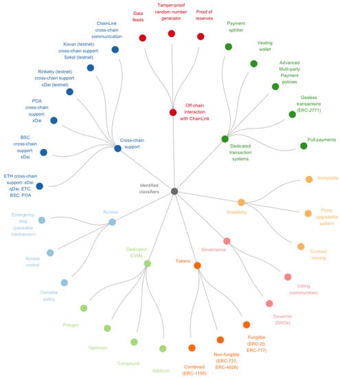 The development of smart contracts enabling Cloud-to-Edge architectures is a complex task that requires experienced developers in combination with the usage of analysis tools [13] to avoid or minimize the known vulnerabilities in the design process of smart contracts. To better understand the design of smart contracts in the Ethereum ledger, Angelo et al. [14] performed a study of the smart contracts’ similarities by analyzing the design of their interfaces and grouping them into a small set of clusters. The relevance of code reutilization was further studied by Chen et al. [15], and the authors found that 26% of the contract code blocks were reused until early 2021. In collaboration with the EVM-based ledger solutions, individual researchers and companies, such as OpenZeppelin, actively started to promote the usage of production-ready smart contract templates in the development process. Moreover, a particular focus on understanding tokenomics was proposed as a design-oriented morphological framework by Freni et al. [16].