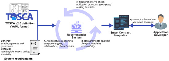 - The Recommender System receives the requirements and specifications as input and assembles a set of smart contract templates, which will be further selected by the application developer and further implemented in comprehensive fully functional dedicated smart contracts.