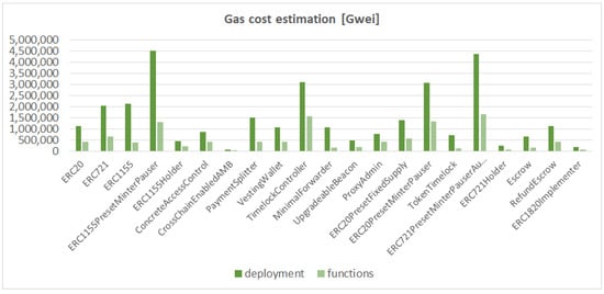 Our cost estimation methodology follows the following steps: (i) deployment of smart contract in a local testnet environment, (ii) the execution of all available smart contract functions with dedicated gas estimation function or empirically execute complex functions [28], and a (iii) summary of the operational cost obtained in the first and second steps. We use the default Gas parameters within the TruffleSuite (https://trufflesuite.com/ (accessed on 14 October 2022)) framework to simulate the EVM environment. The experiments were performed on deployable smart contracts of type contract and the simulation’s results are shown in Figure 7. The aim of the experiment is to prove the sustainability of smart contracts within the IoT fog environment.