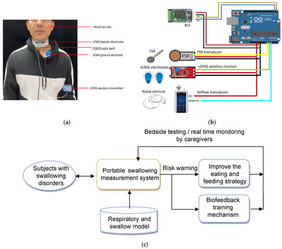 (a) Positions of each sensor: sEMG, nasal airflow, and FSR; (b) the circuit of the designed signal collector; (c) the real-time respiratory–swallowing telecare model.