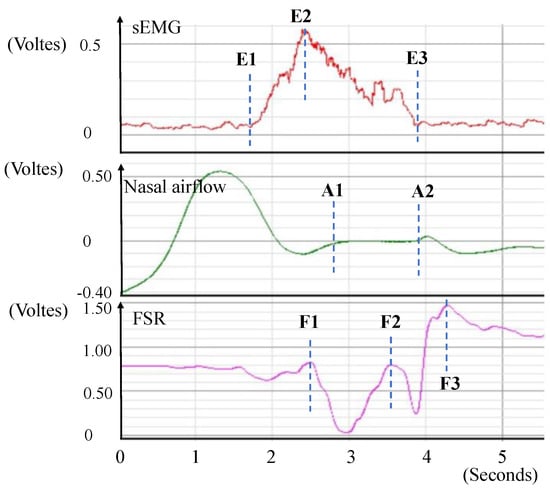 Figure 2 presents the synchronized signals that were detected by the sensors when a normal participant swallowed 10 mL of room-temperature water. The sEMG waveform indicated submentalis activity during swallowing (E1 to E3), with the largest force being recorded at E2. Synchronously, the nasal airflow waveform indicated a sign of apnea (A1 to A2). This was regarded as a protective phenomenon that allows for safe swallowing without aspiration. The FSR waveform typically displays a W-shaped response to represent the two phases of thyroid cartilage excursion. The first phase (F1 to F2) represents the movement of the thyroid cartilage upward and forward to block the trachea and ensure that water smoothly passes through the pharynx to the esophagus. The second phase (F2 to F3) represents the movement of the thyroid cartilage back to its original position. Table 1 lists the variables that describe a complete swallowing process, and they can be used to measure the latency, duration, and amplitude among the related signals. Two possible respiratory phases were observed before and after the respiration apnea period, namely, expiration (EXP) and inspiration (INP). These entail four possible respiratory patterns: EXP/EXP, EXP/INP, INP/EXP, and INP/INP. Only EXP/EXP was regarded as a physiologically safe swallowing pattern.