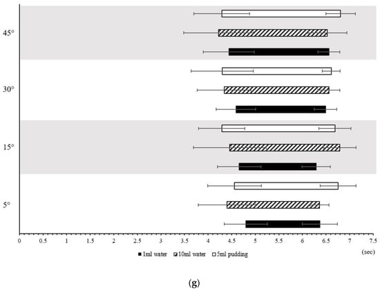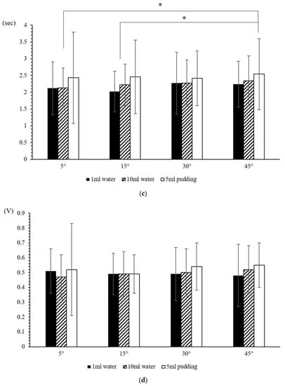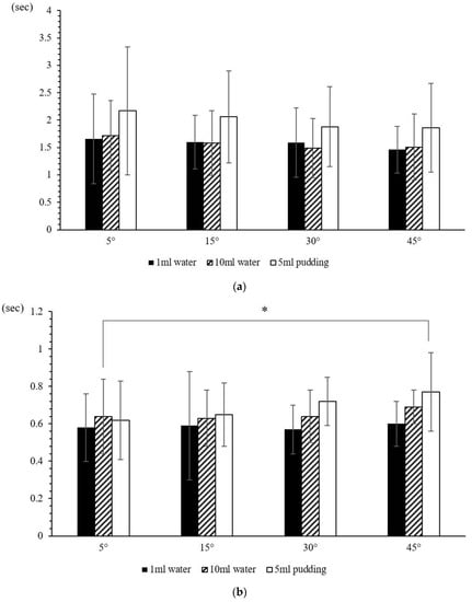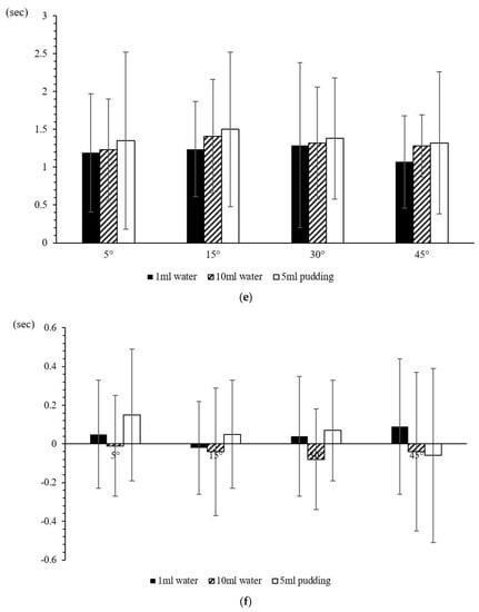During feeding, trunk positioning directly affects respiratory–swallow coordination and feeding safety, especially for individuals with disabilities, but this problem is often neglected in practice. Because different types of care recipients have different means of compensating for swallowing (e.g., older adults with sarcopenic dysphagia [24], individuals with stroke or cerebral palsy with spasticity or spasm in the oral or pharyngeal muscles [25,26,27], and individuals with parkinsonism [22]), a caregiver may be unaware of the effects of body positioning on swallowing and breathing. When a care recipient cannot clearly express their feelings or actively change their body position during the feeding process, they are exposed to risks relating to the feeding process. With regard to the recommended angle of inclination during feeding, the results of the present study indicated that a care recipient can swallow more easily when they are sitting upright (5°) than when they are leaning backwards (45°). The recorded thyroid cartilage excursion and apnea time were significantly longer when the 45° inclination was adopted. This finding indicated that the participants required more time to return their thyroid cartilages back to their original positions after swallowing when the 45° inclination was adopted. This phenomenon is usually observed during the early stage of dysphagia [28]. In addition, the feedback from participants indicated that many of them felt discomfort and were concerned about choking when they were in the 45° inclination. The results also revealed significant differences in food content concerning numerous variables. Swallowing pudding required a significantly longer time than swallowing 1 mL of water during submentalis activity, thyroid cartilage excursion, and the second deflection.