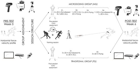 The present study aimed (i) to compare the effect of two different configurations of within-season training load distribution (Microdosing Group (MG) vs. Traditional Group (TG)) on sprint kinetics with a specific focus on the horizontal force–velocity profile (HFVP); and (ii) to compare the fatigue induced by these two approaches as assessed by a daily Countermovement Jump (CMJ) height test [14]. It was hypothesized that the microdosing (MG) group protocol, characterized by a greater workload distribution (i.e., higher frequency of training sessions and a lower volume of loads per session), would exhibit a lower level of fatigue after specific training sessions, potentially leading to varying degrees of adaptation.