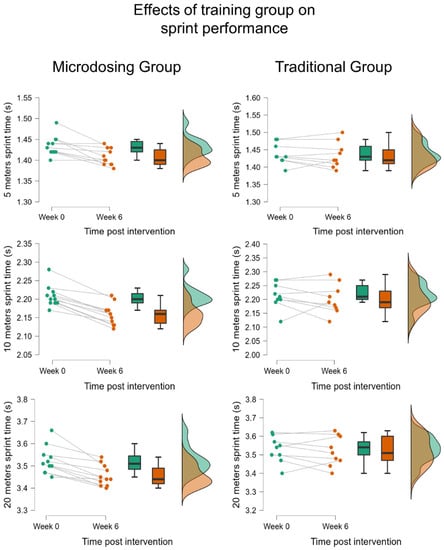 Effects of training group on sprint performance. Colours are indicating the values before (green) and after the training intervention (orange). But it is the same in the left and right columns because the left column is for Microdosing group and right column is for the traditional group.