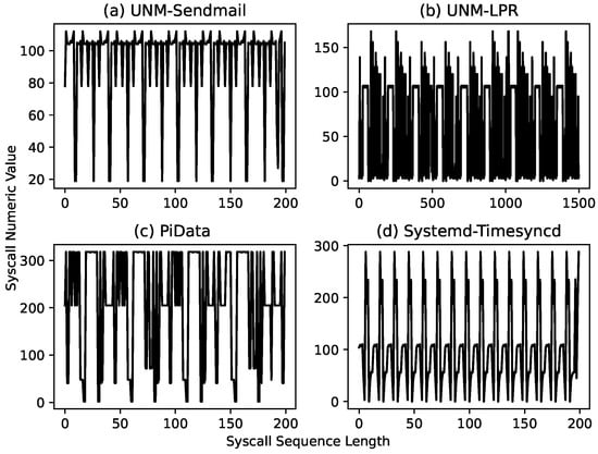 Line plot of syscall sequences taken from three datasets (a–c) and a standard Linux process (d). Each syscall sequence exhibits a repeated pattern of varying length, for example, the UNM Sendmail plot shows that the syscall pattern is repeated after 15 calls, whereas in the UNM-LPR plot, the syscall pattern is repeated after approximately 166 syscalls.