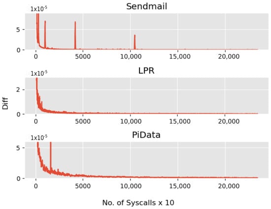Similar to this is the work of Hoang et al. [] in which two long short-term memory (LSTM) networks are trained using normal data and attack syscall data. For a given syscall sequence, both models estimate a probability value, and a higher probability is considered the final result. The authors reported an important observation that the length of the syscall sequence directly affects the performance of their model, i.e., their approach performed best for a particular length of the syscall sequence (150 in this case) and performed poorly otherwise. The approach proposed by Liao et al. [] attempts to find suitably long sub-sequences of syscall data; however, anomaly detection is performed using an SVM. This approach also supports the fact that the sub-sequence length is an important parameter for differentiating between normal and abnormal syscall sequences. Their proposed approach used a mix of fixed and variable length sub-sequences to train an SVM classifier and achieved a very high with a very low false positive rate. Similarly, [,] used an n-gram of syscall with machine learning approaches, specifically LSTM, one-class SVM, and clustering for detecting malicious syscall sequences. These approaches empirically find a suitable length for n-grams to build the model; thus, they face generalization issues.