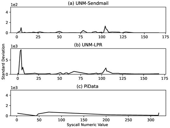 Dataset consistency analysis: Variation in frequency of syscalls of: (a) UNM Sendmail, (b) UNM-LPR, and (c) PiData datasets observed in 10 equal-sized segments. The plot shows the standard deviation in frequencies of three datasets’ syscalls. It can be seen that the frequencies of syscalls in the UNM Sendmail dataset do not vary much in different segments of the dataset, while syscalls in the UNM-LPR dataset show varied syscall frequencies.