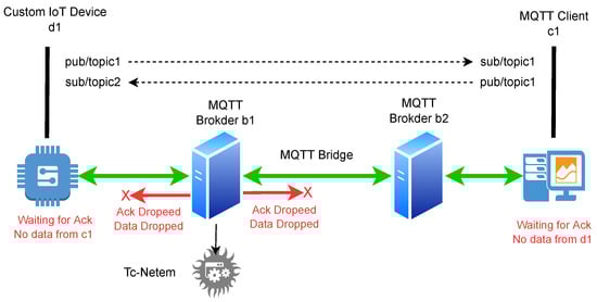 Packet drop attacks [], a type of denial of service (DoS) attack, were emulated in a laboratory environment, as shown in Figure 8. The setup consists of MQTT clients d1 and c1, where d1 is our custom device and two MQTT brokers, b1 and b2, are bridged together so that data published on b1 is delivered to all the devices connected to b2 and vice versa; the black and green lines show the normal communication prior to the attack, while red labels and arrows indicate the situation during the attack. We launched the attack on b1 by executing a traffic policy that drops 80% of the outgoing traffic, this is done by using a well-known Linux utility Netem []. An 80% drop was selected to keep the connections alive, as dropping all traffic would make the broker unavailable, and all connections were terminated. During this attack, data from our IoT device (d1) were dropped at b1 and were delivered to b2 and consequently to c1; however, the data from b1 did not reach d1, which caused long wait and resend queues at d1, and its normal operation was greatly disrupted. We captured several syscall traces during this attack, and selected the longest and shortest traces for diversity.
