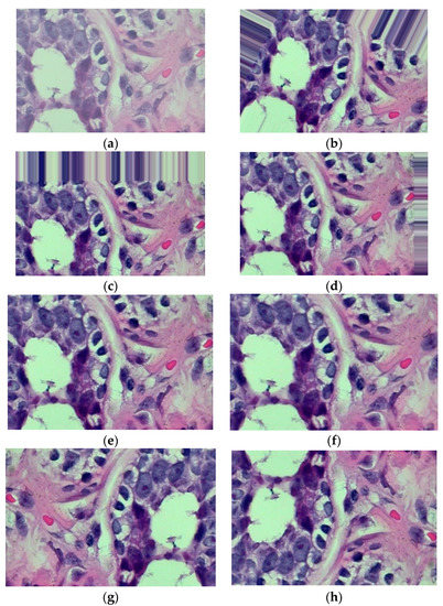 Various image augmentation methods for the same image (a). (a) Original image; (b) Rotated image; (c) Width shift range; (d) Height shift range; (e) Shear range; (f) Zoom range; (g) Horizontal Flip; (h) Vertical Flip.