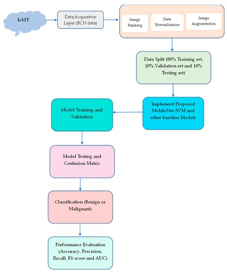 The importance of locally computerized histologic image processing in IoMT technologies has been emphasized in the earlier sections. Thus, a computer vision analysis software approach advocates for a remedy with very minimal storage and computing requirements while maintaining an insignificant drop in accuracy likened to the most sophisticated ones for classifying images now available. A lightweight image-centered classifier with low resource needs and good accuracy makes up our suggested illness prediction model. There are four steps to the suggested solution. The preprocessing phase comes first. The normalization approach is used to preprocess the picture datasets at this point. Additionally, the image augmentation approach is used to enhance the dataset that is already accessible and to help balance the uneven datasets. The training and validation processes make up the second step. In this step, the preprocessed data are utilized to train the “MobileNet-SVM” model that we have suggested. The proposed model’s performance is tested in the third step, known as the testing phase when 20% of the dataset is put aside to assess its effectiveness. Following this, a confusion matrix is used to calculate the model’s performance metrics on the testing dataset. The prediction of illnesses is carried out in the fourth phase, which is the last stage. This aids in evaluating how well the suggested method detects BreakHis v1 400× BCH. In this part, we go over each of these methods concerning the suggested model.