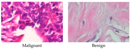 Throughout the world, one of the most important challenges relating to public health is cancer. With 12.5% of all new instances of cancer worldwide each year, breast cancer (BC) is currently the most prevalent cancer in the world. In the U.S., women are anticipated to receive diagnoses for 287,850 new instances of invasive BC and 51,400 new cases of non-invasive (in situ) BC in 2022. It is anticipated that 2710 new instances of invasive BC will have been identified in men. About 1 in 833 men may develop BC in their lifetimes. In the United States, there are more than 3.8 million women who have had breast cancer in the past. Women who are receiving treatment now and those who have concluded therapy are both included in this. In American women, BC is the most often diagnosed type of cancer. About 30% of women’s newly diagnosed cancers are predicted to be BCs in 2022 [1,2]. In particular, BC is the most widespread malignancy and the main reason for cancer-related deaths in women globally [3]. As a result, early detection of this condition is essential to stop its spread and lower the incidence of female morbidity. The likelihood of survival can be significantly increased by early diagnosis. Breast cancer (BC) is a diverse illness made up of several entities with unique biochemical, histological, and clinical characteristics [4]. The development of these cancerous breast cells causes an outbreak that may spread to nearby healthy tissues [4]. Radiology pictures, including those from mammography, ultrasound imaging, and magnetic resonance imaging (MRI), are utilized in the first clinical screening of the condition [5,6]. However, it is possible that these non-invasive imaging techniques will not be effective in identifying the malignant spots. To do this, a more thorough analysis of the malignancy in BC tissues is classically performed using the biopsy procedure. As part of the biopsy procedure, tissue samples are collected, firmly fixed on tiny glass slides, and stained to cause the nuclei and cytoplasm more noticeable [7]. The ultimate diagnosis of BC is subsequently made by pathologists after a microscopic examination of these slides [7].