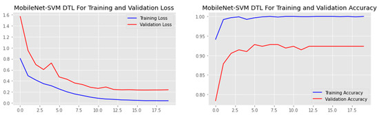 Table 8 shows the computational time complexity for the proposed models. It can be deduced that the baseline MobileNet had the lowest training time of 28 min, while the proposed model (MobileNet-SVM) had the second lowest computational time of 37 min. The time was increased 9 min because of the hybridization of the MobileNet model with the SVM technique. In general, it was deduced that the proposed model with 37 min still had the lowest computation time when compared with the other two baseline pre-trained model, with DenseNet121 having a training time of 62 min and InceptionV3 a training time of 49 min.