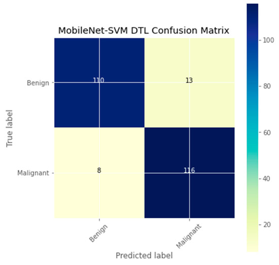 There were three parts to the BreakHis v1 400× BCH dataset: training, validation, and testing. The validation and test sets were applied to assess the effectiveness of the proposed model, while the training set was applied to train the MobileNet-SVM method. As a result, the dataset was divided into the training, testing, and validation groups, with corresponding percentages of 80%, 10%, and 10%. The dataset described in Section 4.1 served as the basis for training the MobileNet-SVM. In total, 1993, 222, and 247 images, respectively, were utilized for training, validation, and testing on the BreakHis v1 400× BCH data. With training, validation, and testing accuracies of 100%, 92.34%, and 91.50% on the training and validation datasets, Table 6 displays the model parameter and values that produced the most efficient results. The study obtained a test accuracy of 91% on the test dataset using the implementation parameters (Table 6).