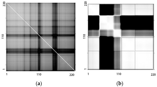 Spectral band-to-band measurement used for segmentation of the Indian Pines HSI: (a) NMI matrix in the image and (b) the correlation matrix in image form.