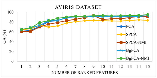 For the AVIRIS Indian Pines dataset, the OAs produced by the studied methods (PCA, SPCA, and SPCA-NMI) and the proposed approach (BgPCA-NMI along with plain BgPCA) are depicted in Figure 5. In this case, a line graph was utilized to assess the relevance of the ranking attributes at each stage. To begin, just the top-ranked feature was utilized to calculate the classification accuracy. The top two features were then used and calculated. Following that, the classification accuracy was computed using the first three characteristics. In this manner, the total classification accuracy was determined and shown in the line graph using the selected features. The traditional PCA and correlation-based SPCA achieved 92.45% and 83.40% OA, respectively. On the other hand, the proposed FR method, BgPCA-NMI, had the highest OA of 94.93% using the same number of features, which clearly indicates the advantage of using the proposed approach. For the HYDICE Washington DC Mall dataset, the OAs for the different methods are illustrated in Figure 6. The OAs produced by PCA and SPCA were 92.8% and 94.81%, respectively, whereas the proposed FR method, BgPCA-NMI, had the highest OA of 99.026% using the same number of features. This also led to the superiority of using the proposed feature space identification over the existing methods.