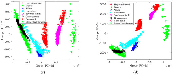 Scatterplots for different methods for the Indian Pines dataset: (a) PCA, (b) SPCA, (c) BgPCA, and (d) BgPCA-NMI.