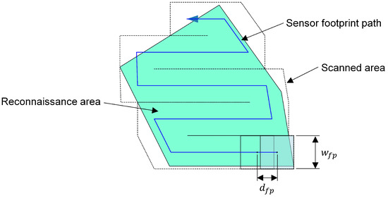 Figure 2. Principle of coverage path planning for a reconnaissance area (green). The sensor footprint path defines the positioning of the individual sensor footprints (pale blue). The size of the footprint is defined by w f p and the Euclidean distance between footprints is determined by d f p . The black dotted line marks the scanned area.