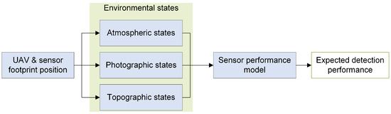 Figure 3. The sensor performance model maps selected environmental states to the expected detection performance of a specific perception chain (not displayed). These environmental states comprise atmospheric, photographic, and topographic conditions resulting from the positioning of the UAV and the sensor footprint on the ground.