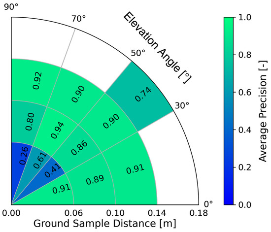 Figure 5 shows the result of the AP for a specific configuration of the environmental states. This also shows the interval ranges for the GSD and elevation angle, resulting in 16 sections. White fields indicate that there is no image data available for this case. It is also evident from the plot that the AP varies depending on the GSD and the elevation angle. We observed similar behavior with different compositions of the atmospheric conditions. Therefore, by employing a newer YOLO detector (e.g., YOLOv4 [43]), we also expect the AP to be dependent on the GSD and the elevation angle, which means that our approach to modeling the sensor performance model will still hold. However, when applying a newer YOLO version, the AP values in the individual intervals are expected to shift towards higher values, as shown by an investigation of [44] for YOLOv3, YOLOv4 and YOLO5l.