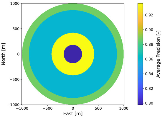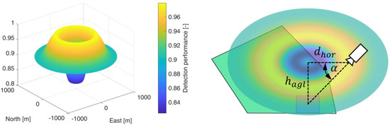 In the left image of Figure 6, a perception map resulting from the CC sensor performance model is shown as a three-dimensional plot. The north-east plane coincides with the UAV’s plane of motion and the z-direction represents the quantitative value of the predicted detection performance as a measure of the F1-score or the average precision, depending on the applied sensor performance model. The detection performance is color-coded for better illustration. The perception map shown contains areas with a maximum performance of 0.98 (yellow colored area) and a minimum value of 0.83 (blue colored area). If sensor data are acquired in an area of the perception map with a high value, this will result in high predicted detection performance for the applied perception chain. This is indicated in the right graph by a camera symbol in the yellow region. From this plotted sensor position and the corresponding elevation angle α , a high detection performance results. The elevation angle is calculated from the horizontal distance d h o r and the altitude above ground h a g l . A representation of the perception map resulting from the sensor performance model with the YOLOv3 object detector is given in Figure 7.