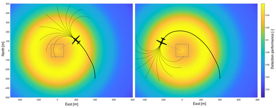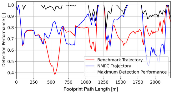 Another decisive advantage is that the maximum value of the detection performance can be determined for each individual sensor footprint from the associated perception map. This maximum value is therefore the upper bound of the detection performance of the respective perception map. The average of the maximum values of all perception maps yields the maximum average detection performance for the assigned reconnaissance task. This value is used in Section 3 to validate the achieved detection performance by our trajectory optimization.